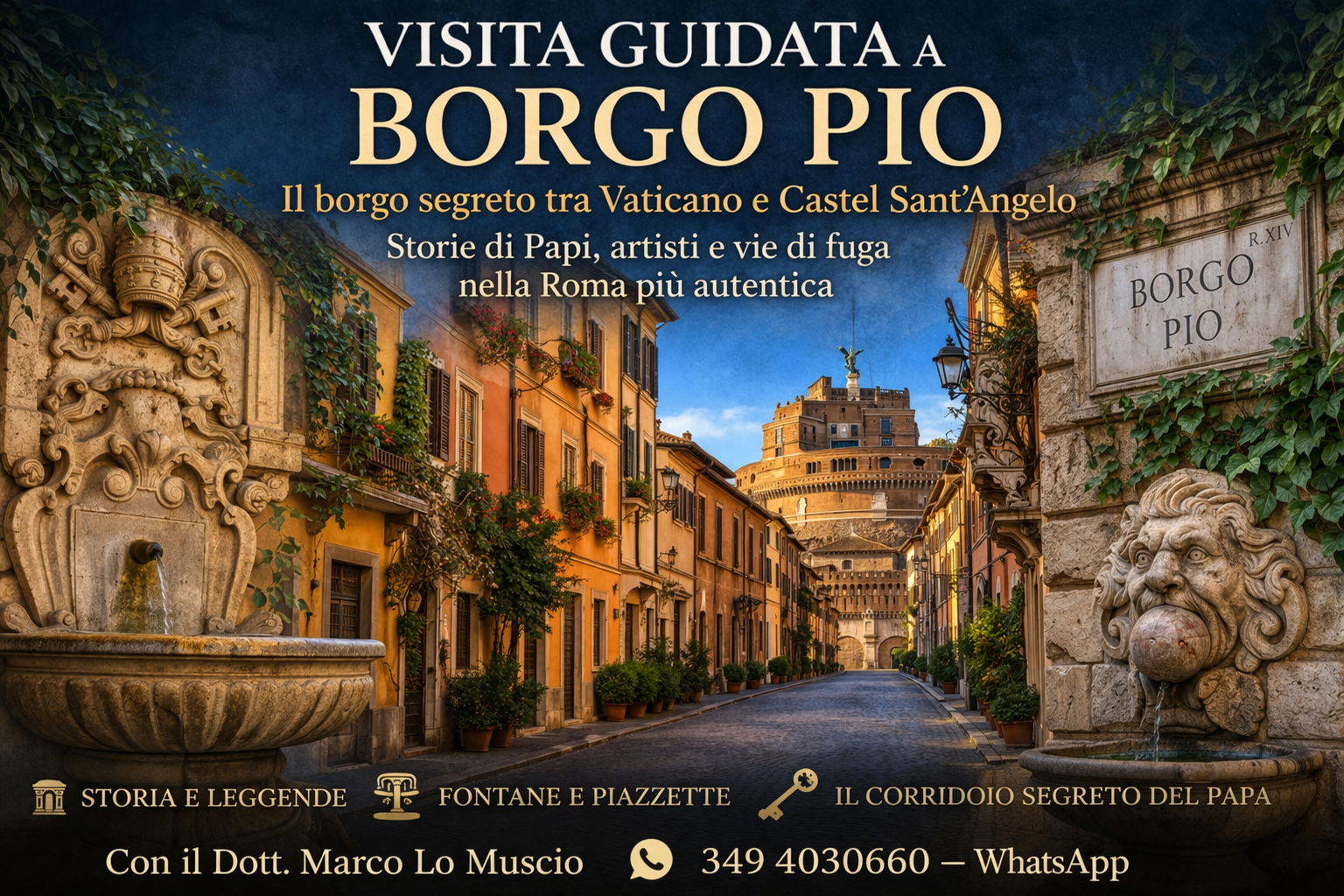 Scopriremo la storia del borgo nato nel Cinquecento per volontà di Papa Pio IV, e il suo ruolo fondamentale nella vita quotidiana della Roma papale, tra artigiani, pellegrini e vita di quartiere.Rivivremo momenti drammatici come il Sacco di Roma, quando il Papa fuggì attraverso il Passetto di Borgo, il celebre corridoio segreto che ancora oggi domina silenziosamente la zona. Un percorso affascinante tra storia, curiosità e dettagli nascosti, perfetto per chi vuole scoprire una Roma più intima e autentica.