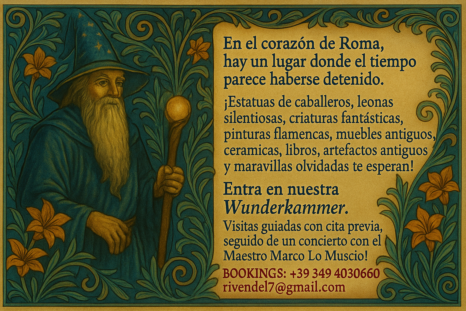 Museo-Casa Wunderkammer: Descubra una de las joyas ocultas más inusuales y fascinantes de Italia, en Roma: una Wunderkammer inspirada en los estilos neogótico, fantástico y flamenco. Nuestro museo-casa se basa en los históricos "gabinetes de curiosidades", donde se reunían obras de arte raras, instrumentos científicos, maravillas naturales y artefactos misteriosos para asombrar e inspirar a los visitantes. En su interior encontrará objetos extraordinarios, historias únicas y una atmósfera suspendida entre arte, historia y misterio. Es la experiencia perfecta para amantes de la cultura, familias, mentes curiosas y viajeros que buscan algo verdaderamente diferente. Entrar en la Casa-Museo del Maestro Lo Muscio es como atravesar el armario de Las Crónicas de Narnia y acceder a otra dimensión: un mundo mágico de cultura, arte, alquimia y gran música. Tras la visita guiada, los visitantes pueden disfrutar de un concierto de piano y órgano interpretado por Marco Lo Muscio, músico internacional y colaborador de Steve Hackett (Genesis).