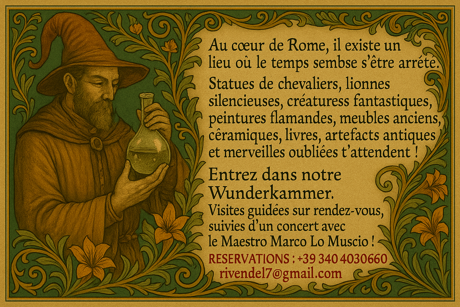 Maison-Musée Wunderkammer: Découvrez l'un des trésors les plus insolites et fascinants d'Italie, à Rome, une Wunderkammer d'inspiration néogothique, fantastique et flamande. Notre maison-musée s'inspire des anciens « cabinets de curiosités », où l'on rassemblait objets d'art rares, instruments scientifiques, merveilles naturelles et artefacts mystérieux pour étonner et inspirer les visiteurs. À l'intérieur, vous trouverez des pièces extraordinaires, des histoires uniques et une atmosphère suspendue entre art, histoire et mystère. C'est une expérience idéale pour les passionnés de culture, les familles, les esprits curieux et les voyageurs en quête de quelque chose de vraiment différent. Entrer dans la maison-musée du Maestro Lo Muscio, c'est comme passer par l'armoire des Chroniques de Narnia et accéder à un autre monde — un univers magique de culture, d'art, d'alchimie et de grande musique. Après la visite guidée, il est possible d'assister à un concert de piano et d'orgue donné par Marco Lo Muscio, musicien international et collaborateur de Steve Hackett (Genesis).