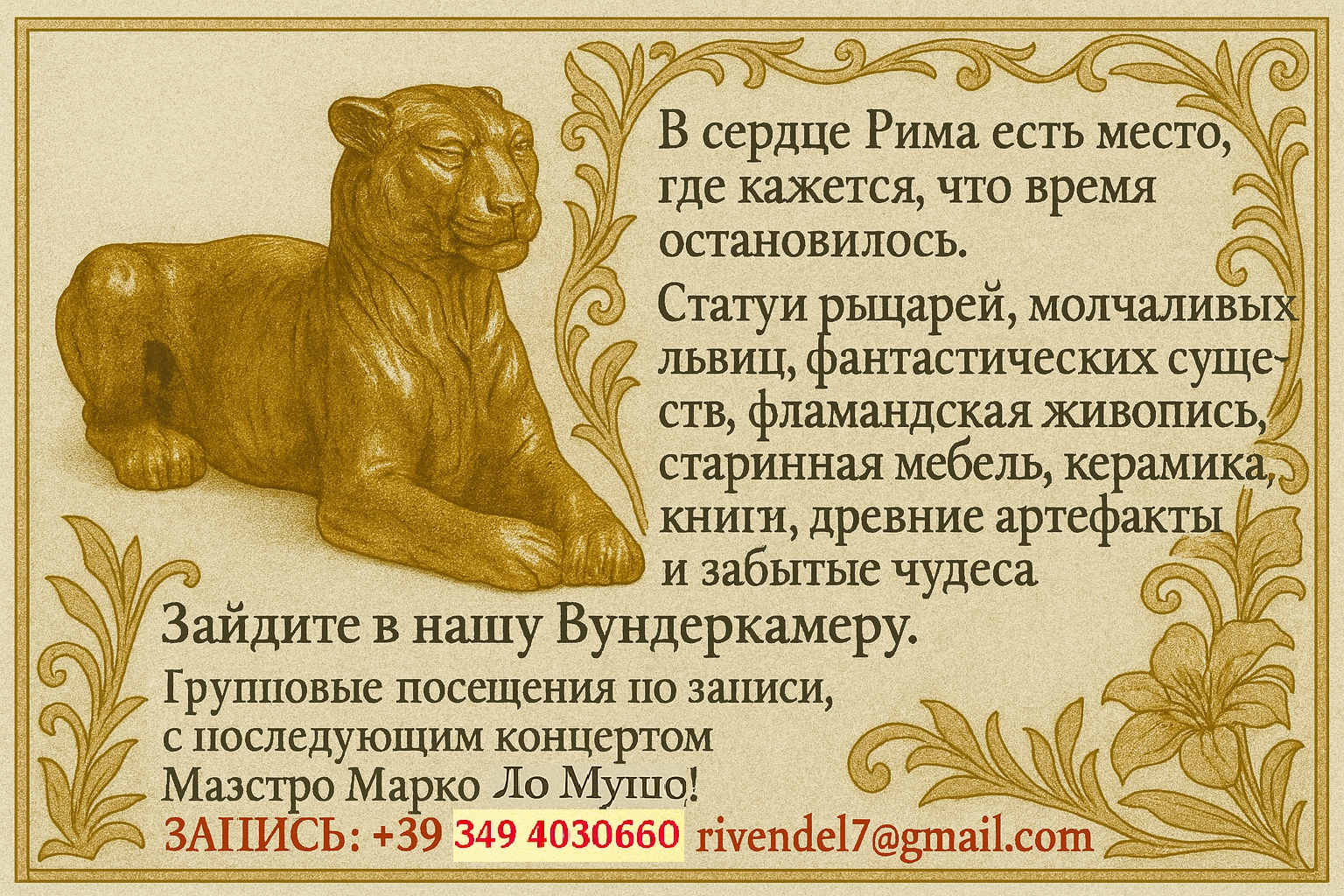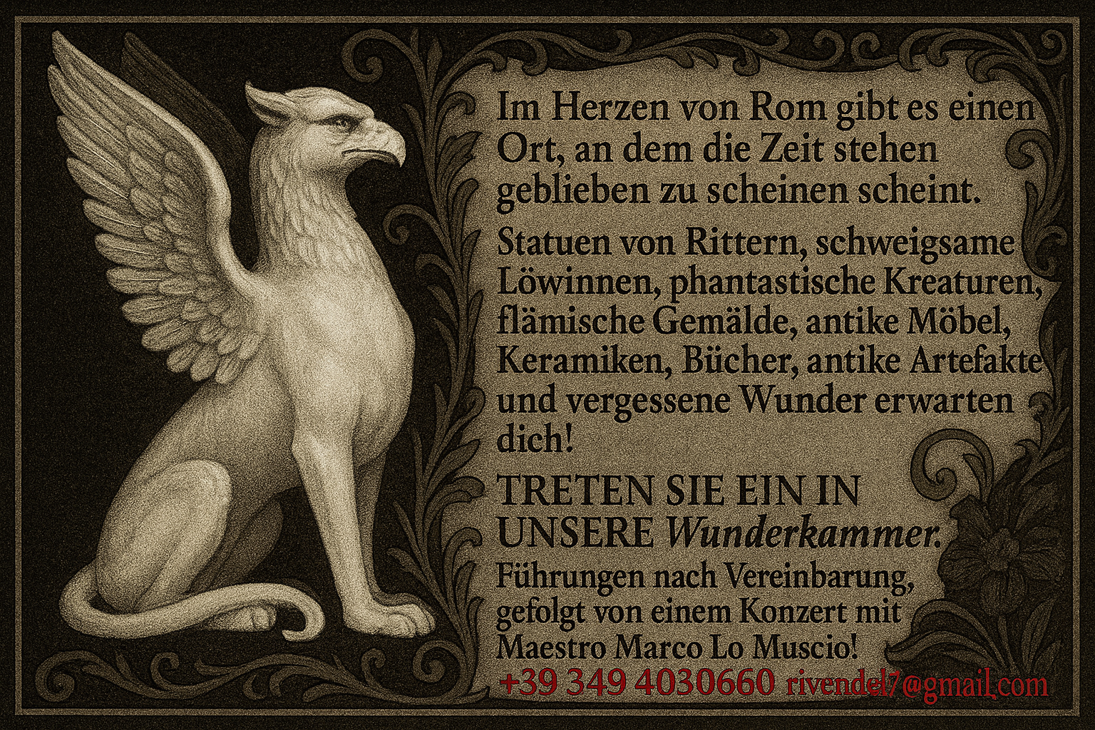 Дом-Музей Вундеркаммер: откройте одно из самых необычных и удивительных мест Италии, расположенное в Риме — Вундеркамеру, вдохновлённую неоготикой, фэнтези и фламандским стилем. Наш дом-музей основан на исторических «кабинетах редкостей», где собирали редкие произведения искусства, научные инструменты, природные чудеса и таинственные артефакты, чтобы поражать и вдохновлять посетителей. Внутри вас ждут необычные объекты, уникальные истории и атмосфера, объединяющая искусство, историю и мистику. Это идеальное место для ценителей культуры, семей, любознательных гостей и путешественников, ищущих что-то по-настоящему особенное. Войти в дом-музей Маэстро Ло Мушо — будто шагнуть в гардероб из Хроник Нарнии и оказаться в другом измерении — мире культуры, искусства, алхимии и великой музыки. После экскурсии посетители могут насладиться концертом фортепиано и органа в исполнении Марко Ло Мушо, международного музыканта и соратника Стива Хакетта (Genesis).
