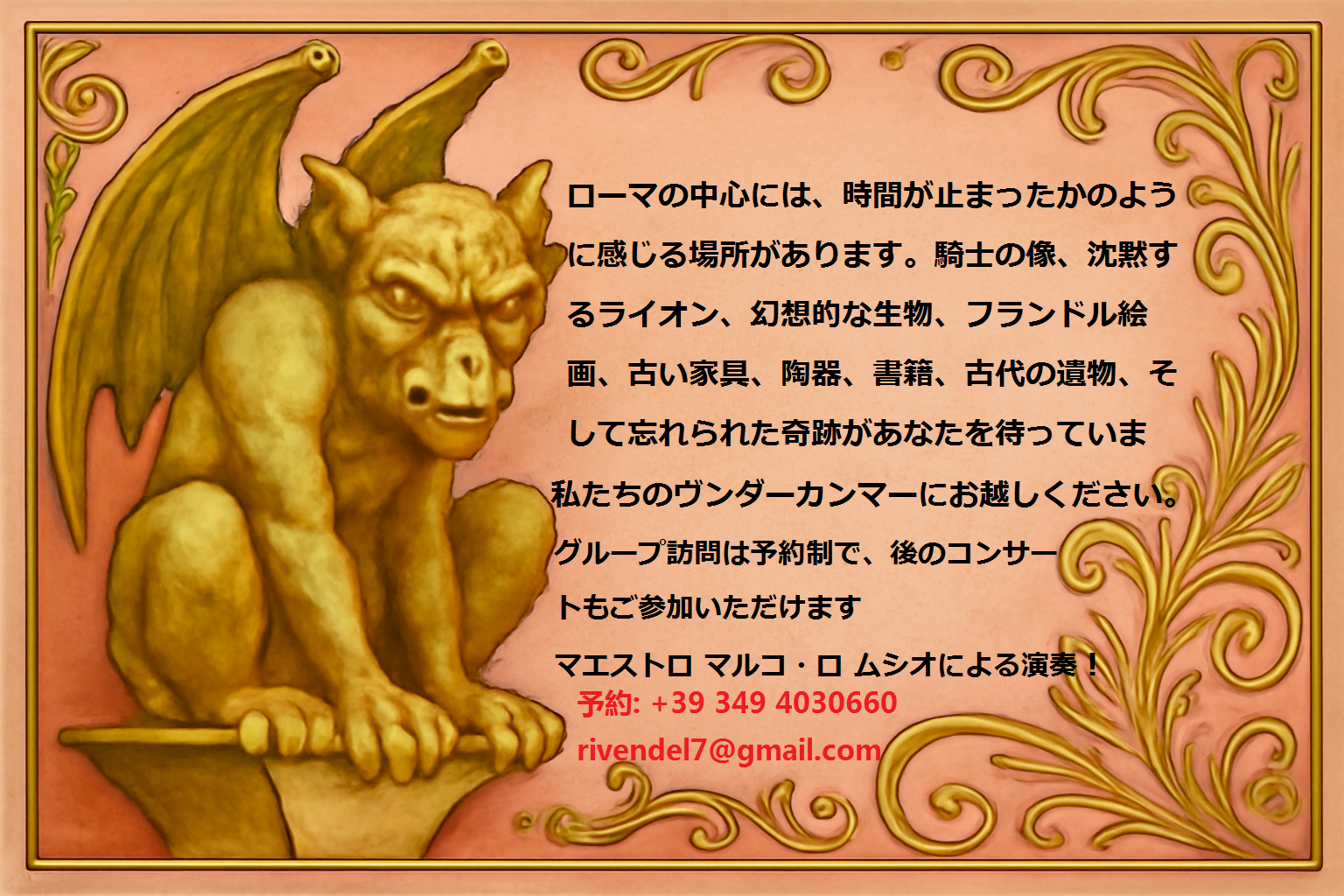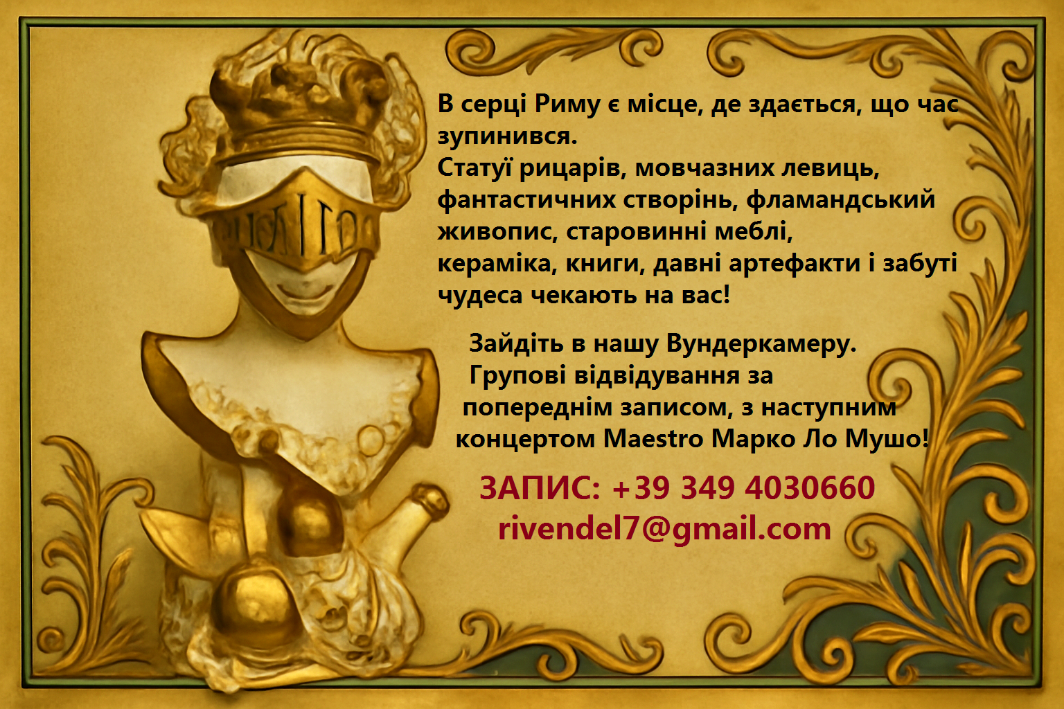 Будинок-Музей Вундеркамера: відкрийте одну з найцікавіших і найнезвичніших перлин Італії — Вундеркамеру в Римі, створену у неоготичному, фентезійному та фламандському стилях. Наш будинок-музей ґрунтується на історичних «кабінетах курйозів», де збирали рідкісні мистецькі об'єкти, наукові інструменти, природні дива та загадкові артефакти, щоб дивувати й надихати відвідувачів. Усередині на вас чекають незвичайні предмети, унікальні історії та атмосфера, що поєднує мистецтво, історію й містичність. Це ідеальна подорож для поціновувачів культури, сімей, допитливих гостей і мандрівників, які шукають щось особливе. Потрапити до будинку-музею Маестро Ло Мушо — ніби пройти крізь шафу з Хронік Нарнії та ступити в інший вимір — світ культури, мистецтва, алхімії та великої музики. Після екскурсії відвідувачі можуть насолодитися концертом фортепіано й органа у виконанні Марко Ло Мушо, міжнародного музиканта і співробітника Стівена Гакетта (Genesis).