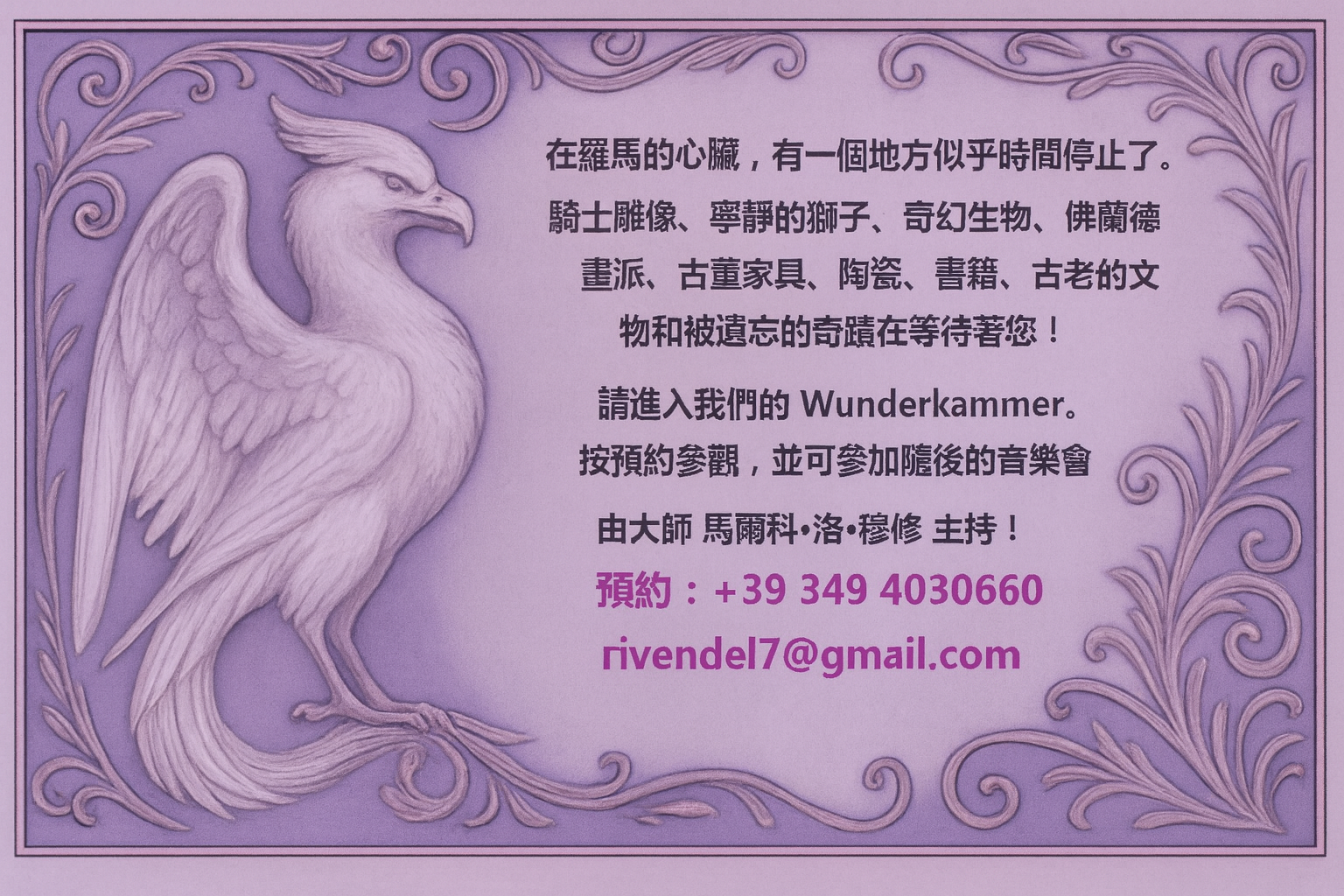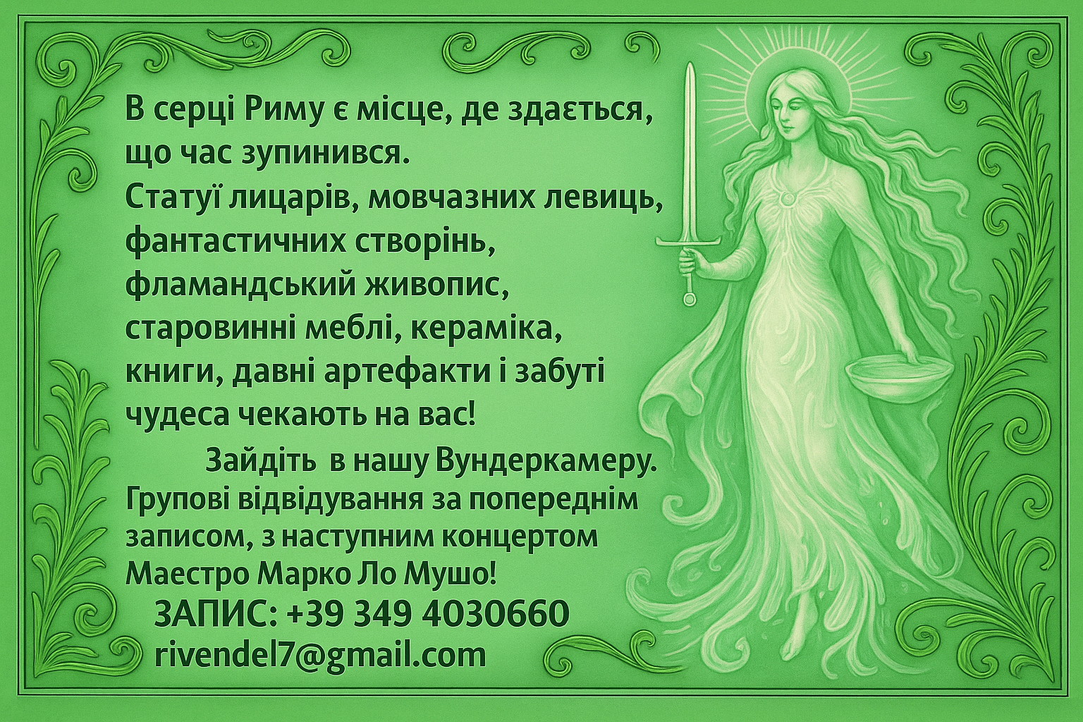 Будинок-Музей Вундеркамера: відкрийте одну з найцікавіших і найнезвичніших перлин Італії — Вундеркамеру в Римі, створену у неоготичному, фентезійному та фламандському стилях. Наш будинок-музей ґрунтується на історичних «кабінетах курйозів», де збирали рідкісні мистецькі об'єкти, наукові інструменти, природні дива та загадкові артефакти, щоб дивувати й надихати відвідувачів. Усередині на вас чекають незвичайні предмети, унікальні історії та атмосфера, що поєднує мистецтво, історію й містичність. Це ідеальна подорож для поціновувачів культури, сімей, допитливих гостей і мандрівників, які шукають щось особливе. Потрапити до будинку-музею Маестро Ло Мушо — ніби пройти крізь шафу з Хронік Нарнії та ступити в інший вимір — світ культури, мистецтва, алхімії та великої музики. Після екскурсії відвідувачі можуть насолодитися концертом фортепіано й органа у виконанні Марко Ло Мушо, міжнародного музиканта і співробітника Стівена Гакетта (Genesis).