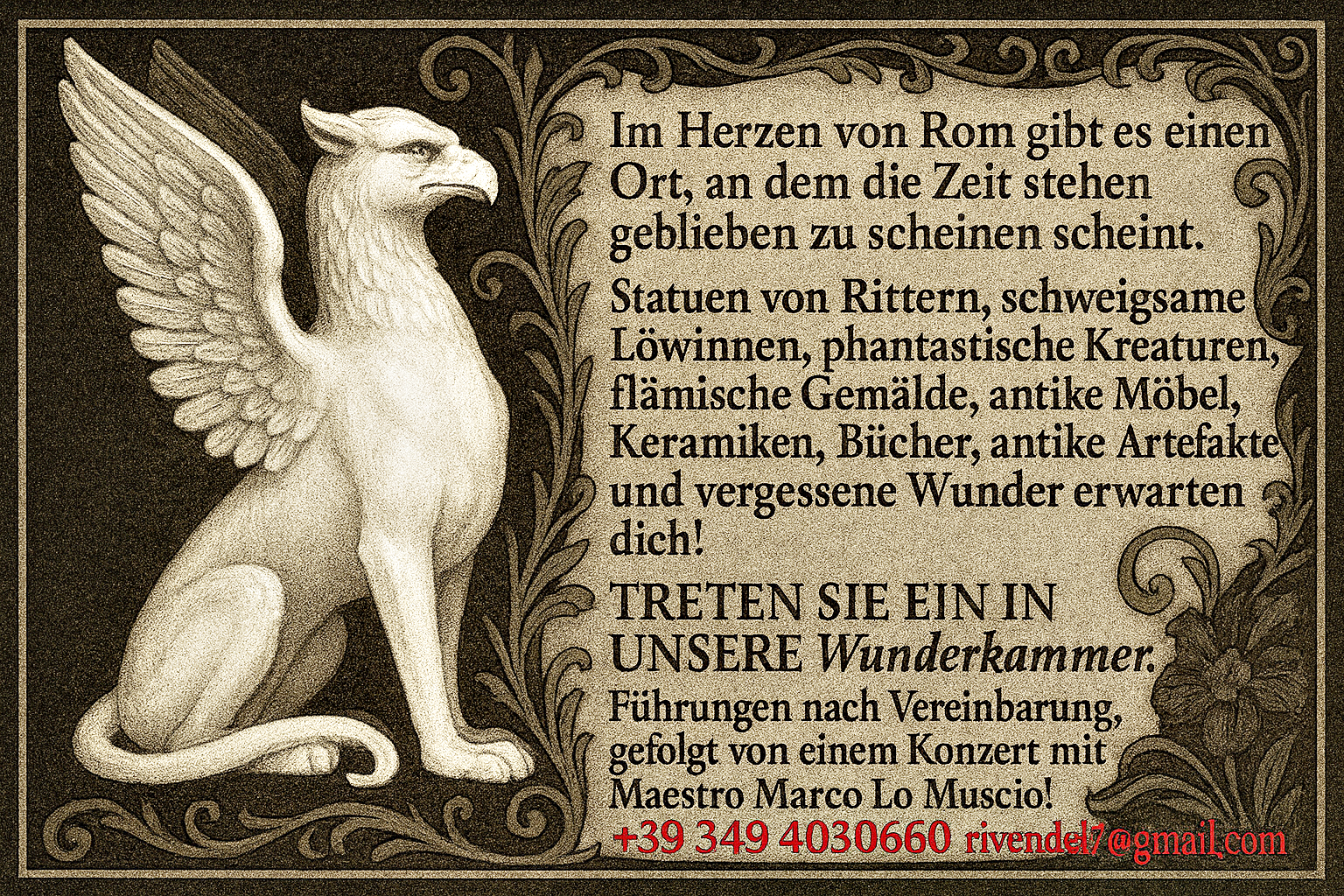 Дом-Музей Вундеркаммер: откройте одно из самых необычных и удивительных мест Италии, расположенное в Риме — Вундеркамеру, вдохновлённую неоготикой, фэнтези и фламандским стилем. Наш дом-музей основан на исторических «кабинетах редкостей», где собирали редкие произведения искусства, научные инструменты, природные чудеса и таинственные артефакты, чтобы поражать и вдохновлять посетителей. Внутри вас ждут необычные объекты, уникальные истории и атмосфера, объединяющая искусство, историю и мистику. Это идеальное место для ценителей культуры, семей, любознательных гостей и путешественников, ищущих что-то по-настоящему особенное. Войти в дом-музей Маэстро Ло Мушо — будто шагнуть в гардероб из Хроник Нарнии и оказаться в другом измерении — мире культуры, искусства, алхимии и великой музыки. После экскурсии посетители могут насладиться концертом фортепиано и органа в исполнении Марко Ло Мушо, международного музыканта и соратника Стива Хакетта (Genesis).