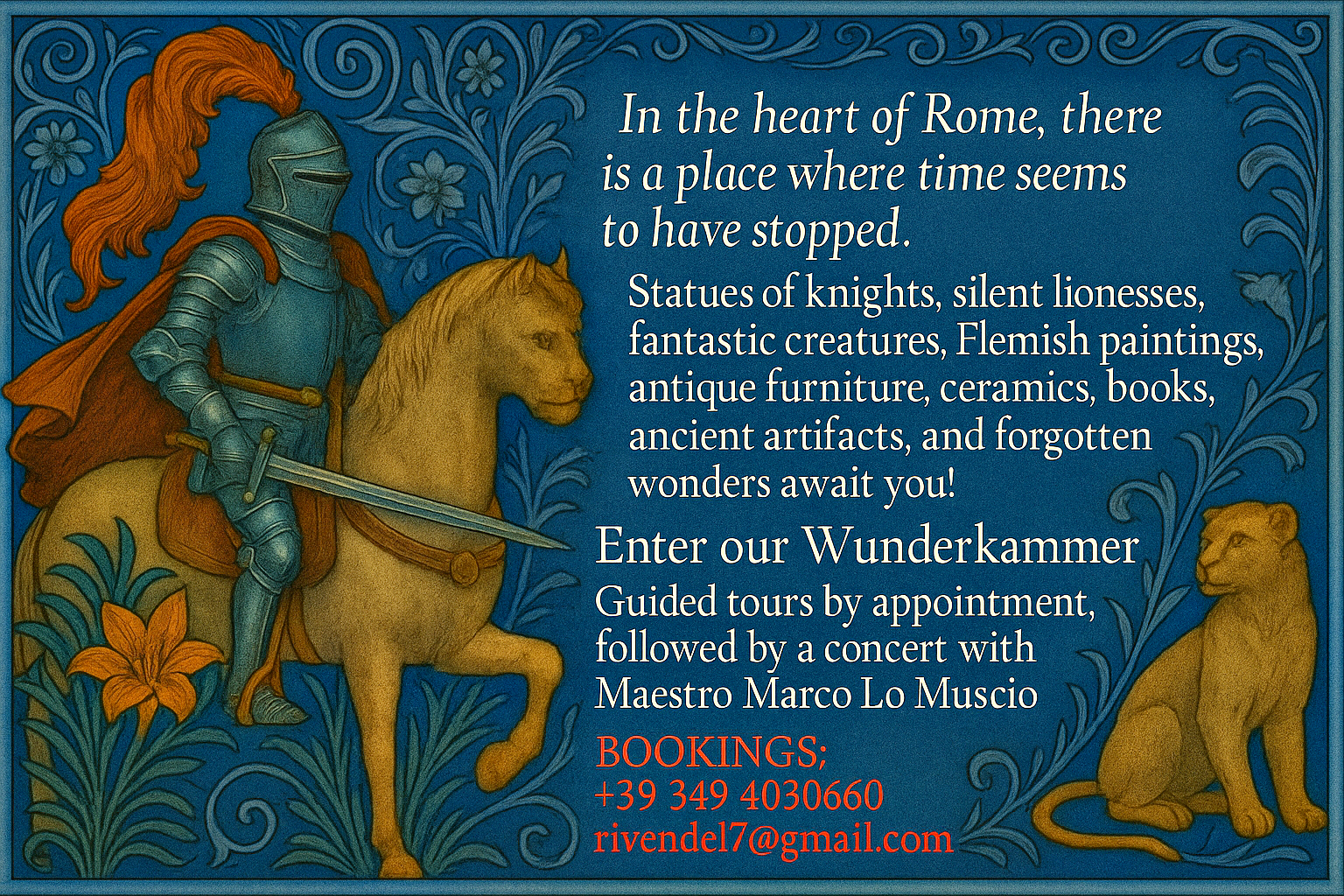 Wunderkammer House-Museum: Discover one of Italy's most unusual and fascinating hidden gems in Rome: a Neo-Gothic, Fantasy and Flemish-inspiredWunderkammer. Our House-Museum is based on the historical "cabinets of curiosities", where rare artworks, scientific instruments, natural wonders and mysterious artefacts were collected to amaze and inspire visitors. Inside you'll find extraordinary objects, unique stories, and an atmosphere suspended between art, history and mystery. It is the perfect experience for culture lovers, families, curious minds and travellers seeking something truly different. Entering Maestro Lo Muscio's House-Museum feels like stepping through the wardrobe of The Chronicles of Narnia into another dimension — a magical world of culture, art, alchemy and great music. After the guided tour, visitors may enjoy a piano and organ concert performed by Marco Lo Muscio, international musician and collaborator of Steve Hackett (Genesis).