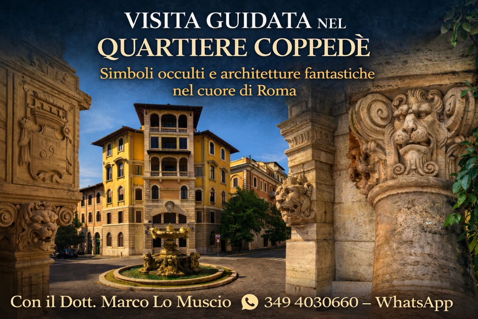 Il Quartiere Coppedè è uno dei luoghi più misteriosi e affascinanti di Roma: un vero museo a cielo aperto ricco di simboli esoterici, richiami medievali, gotici, rinascimenentali e liberty. Concepito e realizzato dall'architetto fiorentino Gino Coppedè tra il 1917 ed il 1927, si trova nel quartiere Trieste intorno al nucleo centrale di Piazza Mincio con la fontana delle rane al centro della piazza e con le palazzine comprese tra via Tagliamento, via Arno, via Ombrone, via Serchio e via Clitunno. Grande anche l'influenza dell'architetto francese Eugène Viollet-le-Duc. Il Dott. Lo Muscio (Direttore del Museo Wunderkammer) vi spiegherà tutti i segreti e le simbologie dei palazzi del Coppedè: api, leoni, aquile, arieti, rane, lumache, galli, pesci, grifoni, chimere, cavalieri, simboli massonici ed alchimistici, ecc...